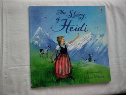 This is a paper back book about a little orphan who is sent to live with their grandfather , with clear text and beautiful illustrations