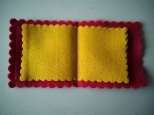 Handmade out of acrylic felt. It measures approximately 19.5 cm x 10 cm on the outside and approximately 15 cm x 8 cm on the inside. It has four pages for all your needles and pins.